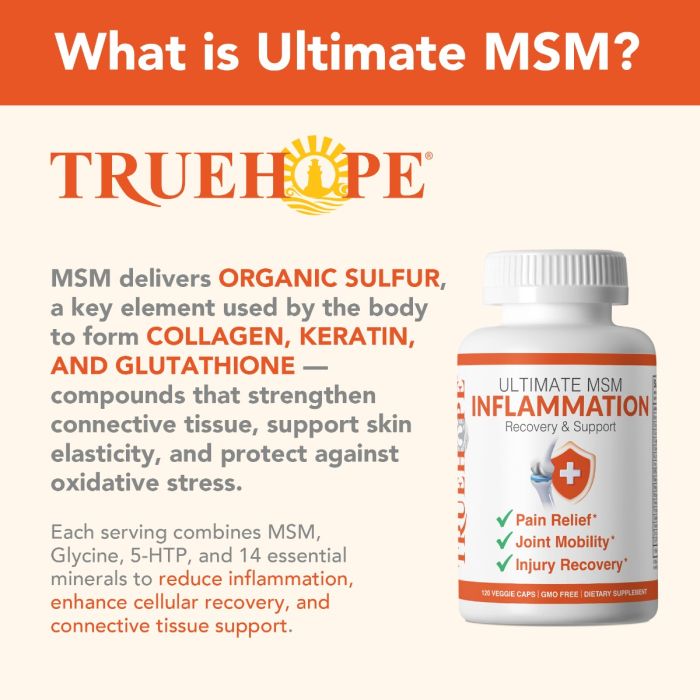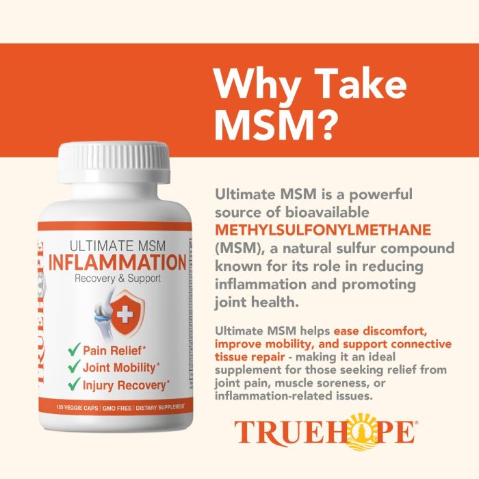 Ultimate MSM is a powerful source of bioavailable methylsulfonylmethane (MSM) — a natural sulfur compound essential for maintaining healthy joints, muscles, and connective tissue. This advanced formulation uses Truehope’s proprietary AMC Technology™ (Advanced Micronization & Chelation) to dramatically enhance nutrient absorption and delivery at the cellular level.