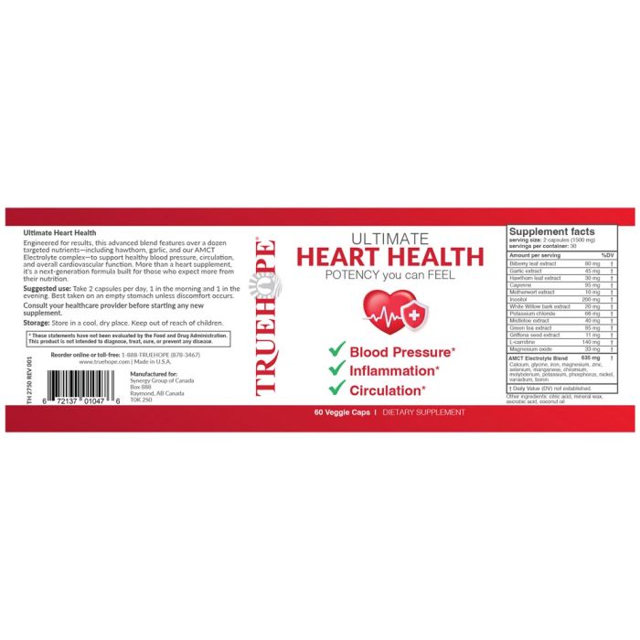 Truehope Ultimate Heart Health harnesses 15 proven ingredients to deliver comprehensive cardiovascular support. The “Advanced Micronization and Chelation Technology” (AMCT) Electrolyte Complex balances essential minerals for steady heart rhythm and blood pressure. Bilberry leaf and hawthorn extracts enhance circulation, while garlic and cayenne support healthy cholesterol and blood pressure naturally. L-Carnitine boosts heart cell energy, and green tea and glycine protect against inflammation and oxidative stress. This balanced, effective formula nourishes your heart—without synthetic fillers or unproven trends.